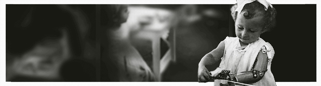 Photo credit: Bette Masters Brown. Edit by Rhian Hinkley. A Black and white rectangular pic. At the left end, ghostly reflections, including a young girl, Beth Duncan, and a table, within a room; on the right, a 5 year old Kath Duncan uses a below elbow arm prosthesis. There is an archival, ghostly feel to the image